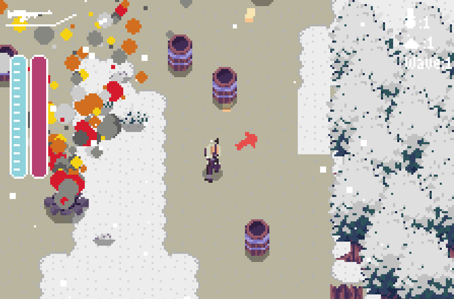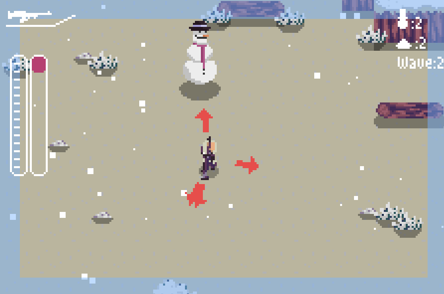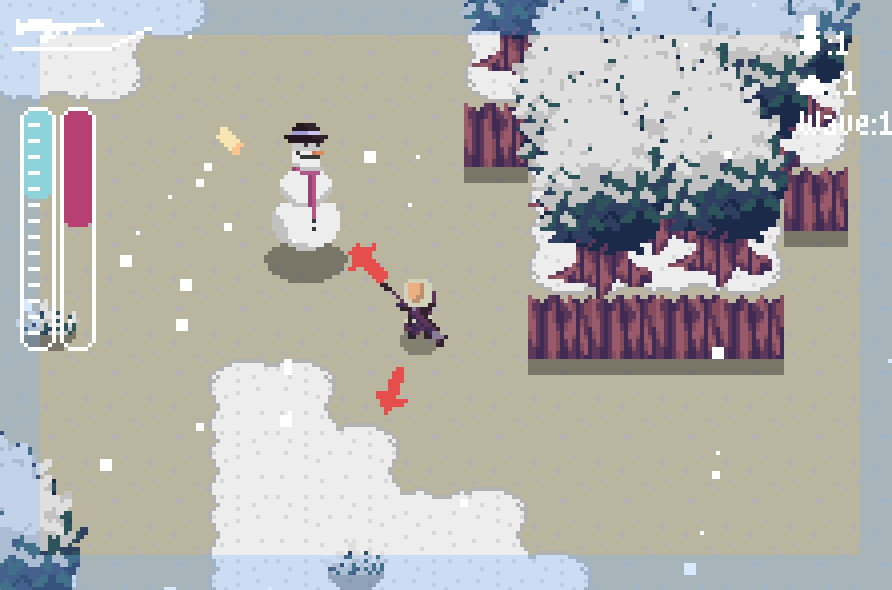 Enemies spawn in waves. Each wave increases the number of enemies, making survival harder over time.The freezing environment slowly lowers your temperature. If your temperature reaches zero, you begin losing health. Staying near the campfire warms you back up.